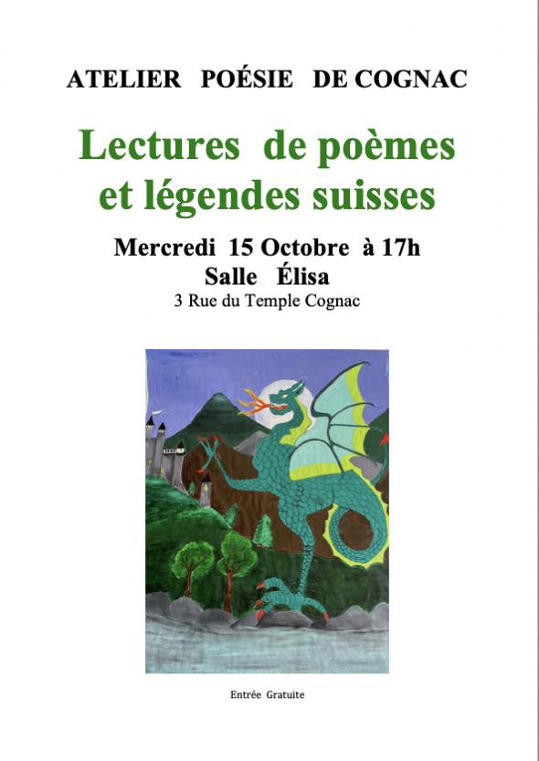 Le Festival des Littératures Européennes de Cognac célèbre cette année la littérature Suisse. L’Atelier Poésie de Cognac, en partenariat avec le festival, propose un animation autour des légendes et des poètes suisses. Nous vous attendons nombreux pour un beau voyage au pays des vouivres, sorcières, fées, loup-garou, Guillaume Tell, l’ours de Berne, etc…