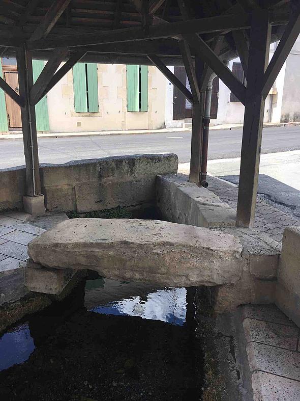 Cette grande et longue pierre sépare la fontaine du lavoir proprement dit au centre du bourg de Migron.